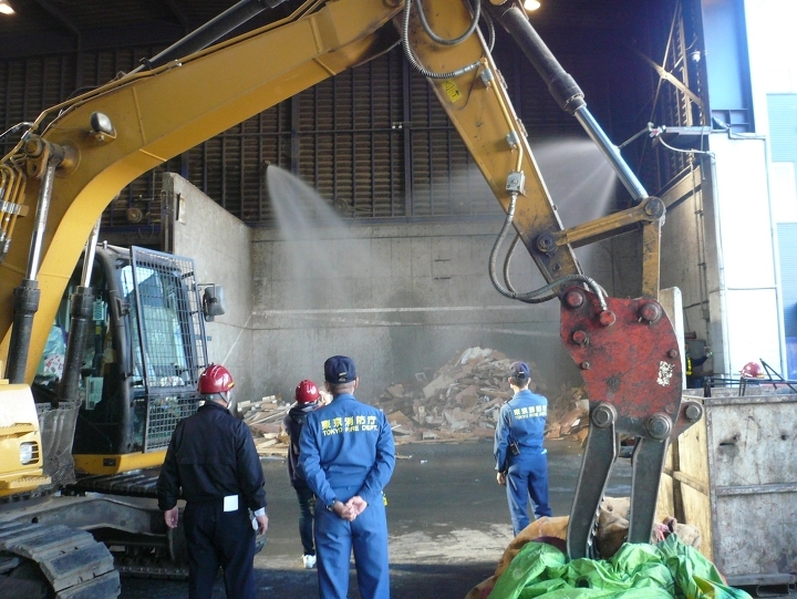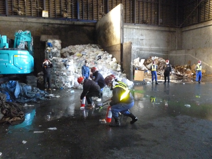 2月の東京都心は、92年ぶりの降水量の少なさを記録し、乾燥の日々が続いております。今回は、処理前廃棄物置場(木くず)からの出火と想定し、主に新人さんを中心に、消火器を使用した初期消火活動、及び放水銃を使用しての自社消火設備の動作確認をいたしました。